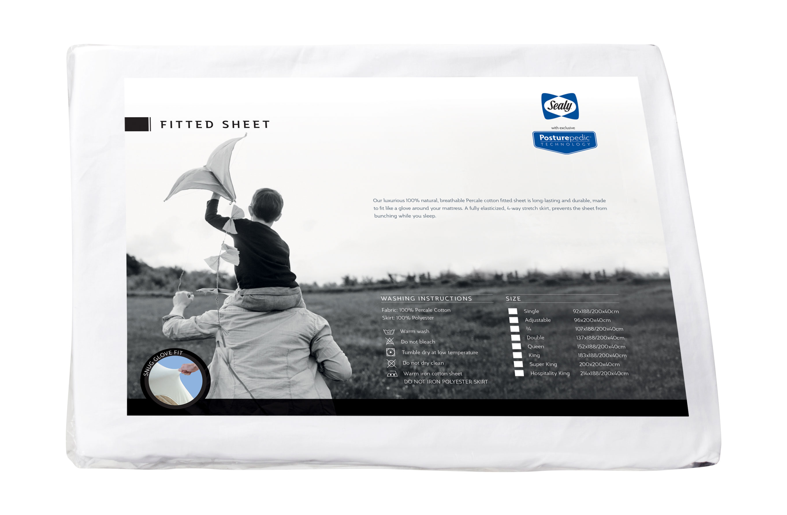 Fitted sheet has unique stretch sides to fit standard, extra length and extra depth mattresses.